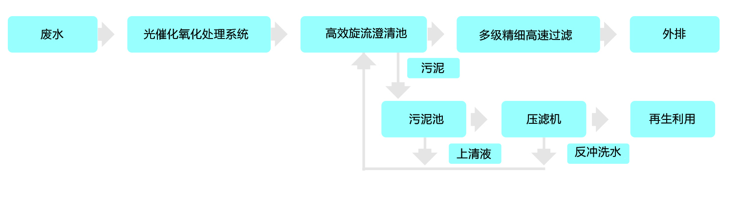 油田采油回注水進入光催化氧化處理系統(tǒng),利用光催化改性陶瓷介質(zhì)作為載體,以可見光為光源,提高活性極強的羥基自由基的產(chǎn)率,通過羥基自由基與廢水中有機物的加成、取代、電子轉(zhuǎn)移等反應(yīng)使大部分有機污染物礦化為二氧化碳、水等簡單無機物。出水再進入高效旋流澄清池,投加改性淀粉絮凝劑,使池中形成活性油渣層,強化廢水中細小油粒與活性油渣層內(nèi)較大油滴的接觸絮凝過程,從而高效除油。同時在裝置進水區(qū)設(shè)計出獨特的喉管混合結(jié)構(gòu),使池中形成小而密實的絮凝體,提高旋流澄清池的絮凝效率。出水經(jīng)輻射式多級精細高速過濾器處理后可達標(biāo)外排。